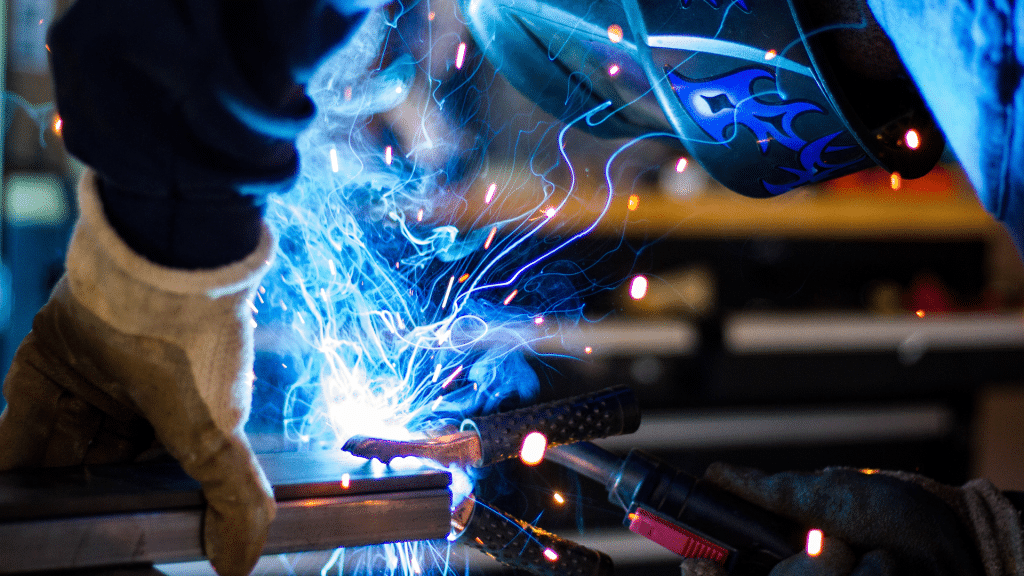 This is an image of an individual welding a piece of metal to go along with a blog post about the Dallas Federal Reserve's manufacturing report.